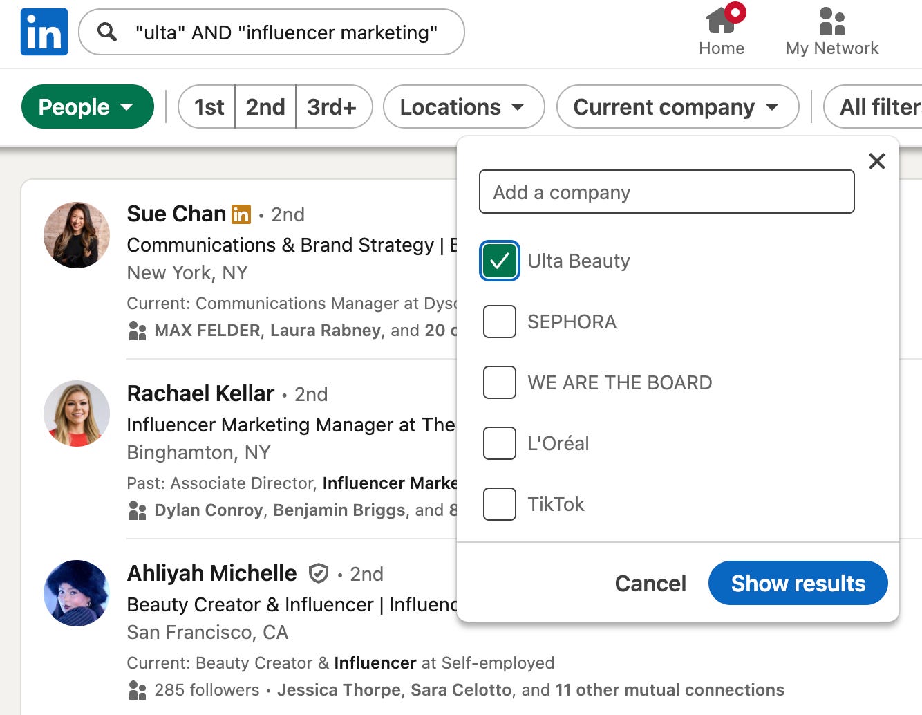 Think of the jobs or companies that interest and inspire you. Use LinkedIn like you use Google. If an ideal company is Ulta Beauty, and you’re interested in influencer marketing, search: “Ulta Beauty” AND “influencer marketing.”